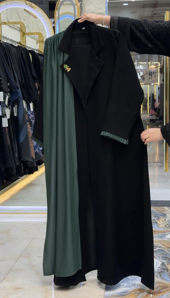 عباية بتصميم أنيق يجمع بين الأسود الكلاسيكي والأخضر المستوحى من ألوان الوطن.