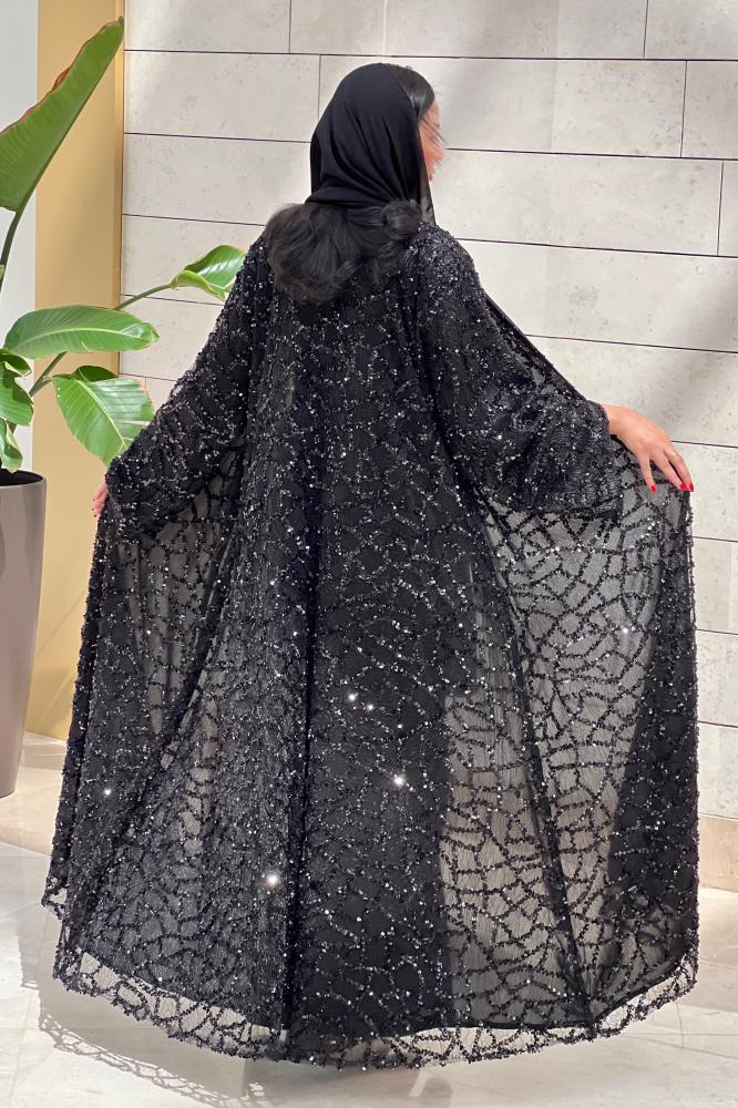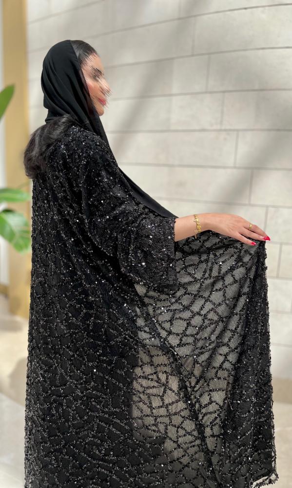 تميّزي بإطلالة تأسر الأنظار مع عباية فرح، المصممة بذوق رفيع لتجمع بين الفخامة والرقي. تأتي العباية بلون أسود أنيق ومطرزة بالكامل بتفاصيل لامعة وتطريزات فاخرة تضيف لها لمسة من البهجة والأنوثة، مما يجعلها خيارًا مثاليًا للمناسبات الخاصة والسهرات الراقية.
