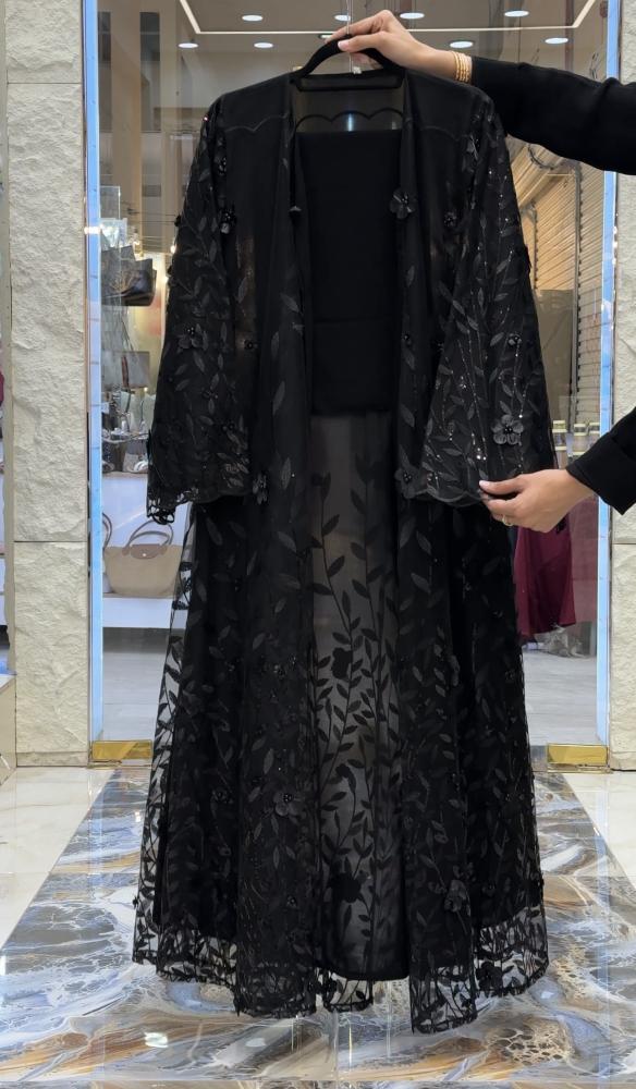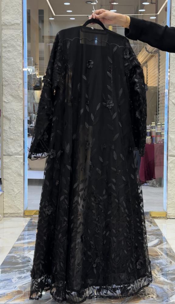 عباية تفوح سحر وأناقة من أول نظرة، مصنوعة من قماش دانتيل فاخر ينساب بنعومة ويمنحك حضور أنثوي فخم.