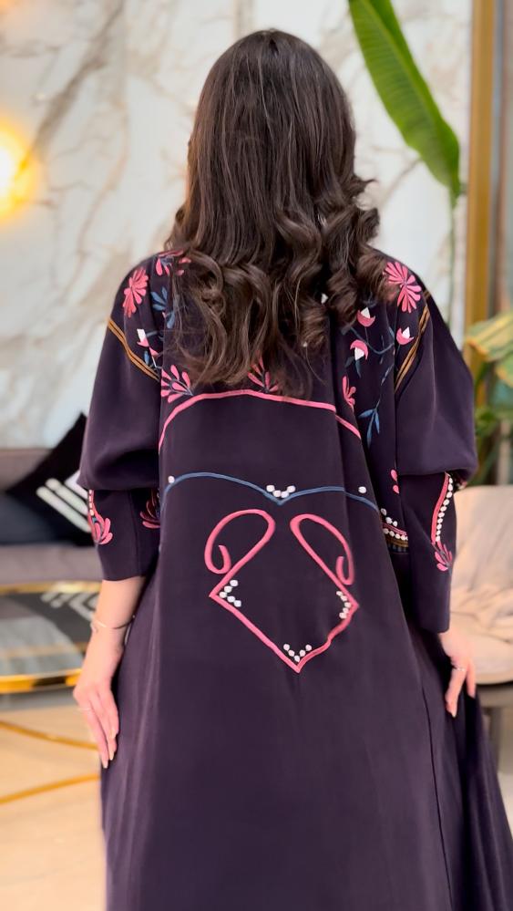 تميّزي بإطلالة تجمع بين الأصالة والحداثة مع عباية ميلان، بتصميم فريد يعكس الذوق الرفيع والروح الجريئة. تطريزات زهرية راقية تزين الأكتاف والصدر، محاطة بتفاصيل دقيقة من الخرز والترصيع تضيف لمسة فنية آسرة.
